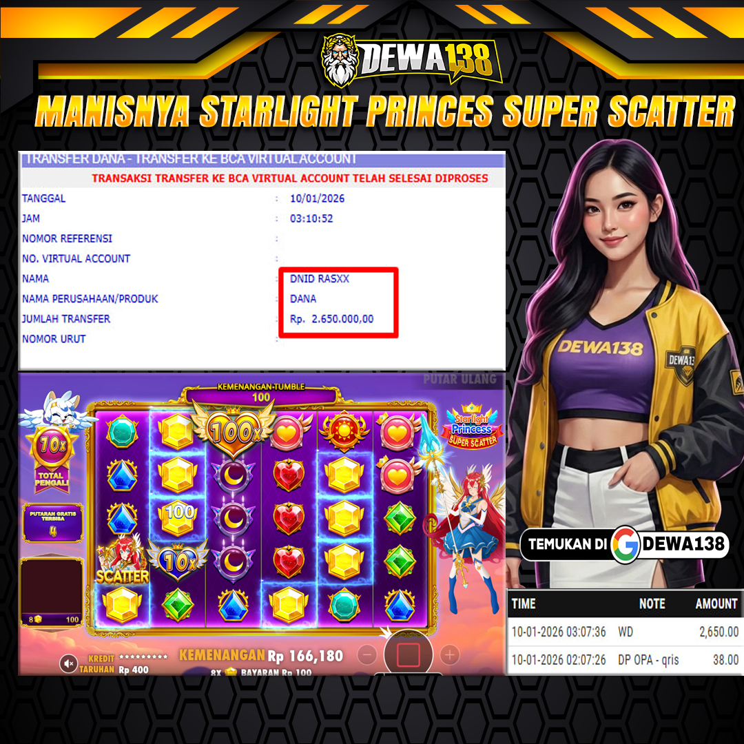 DEWA138 menghadirkan game jackpot vip yang di lengkapi fitur khusus new member hanya dengan modal deposit 38k dijamin akan withdraw 2,6+ juta malam ini.